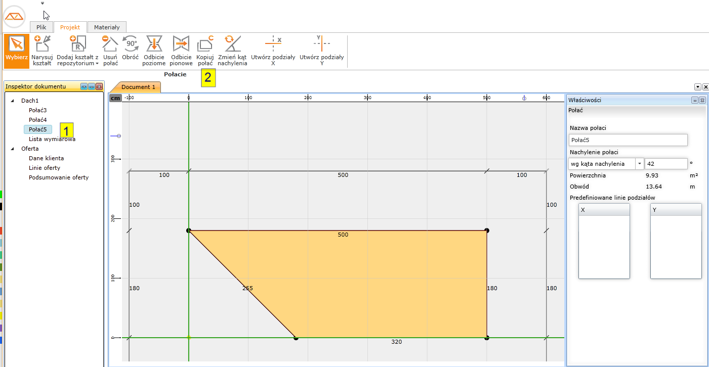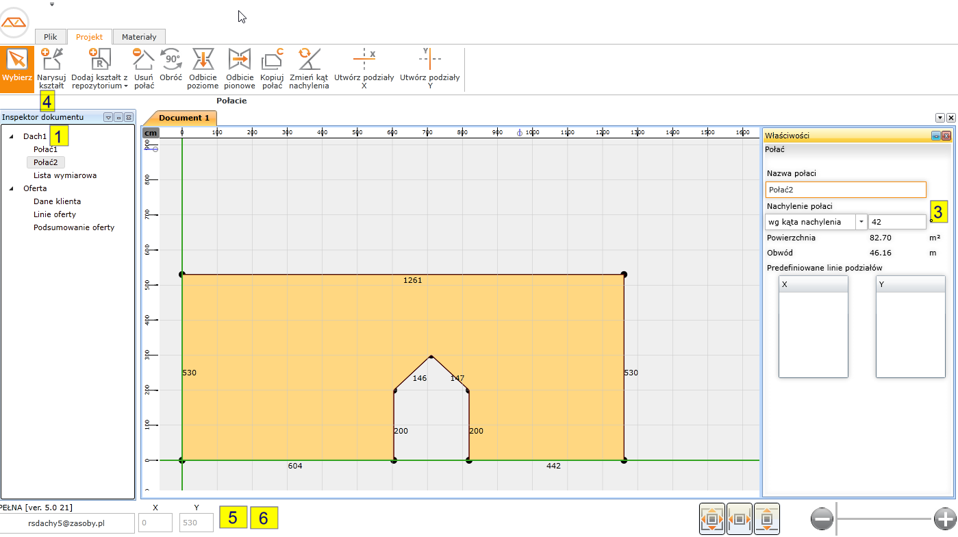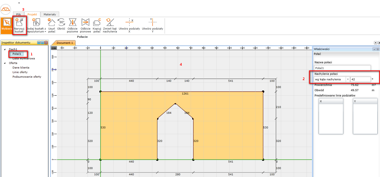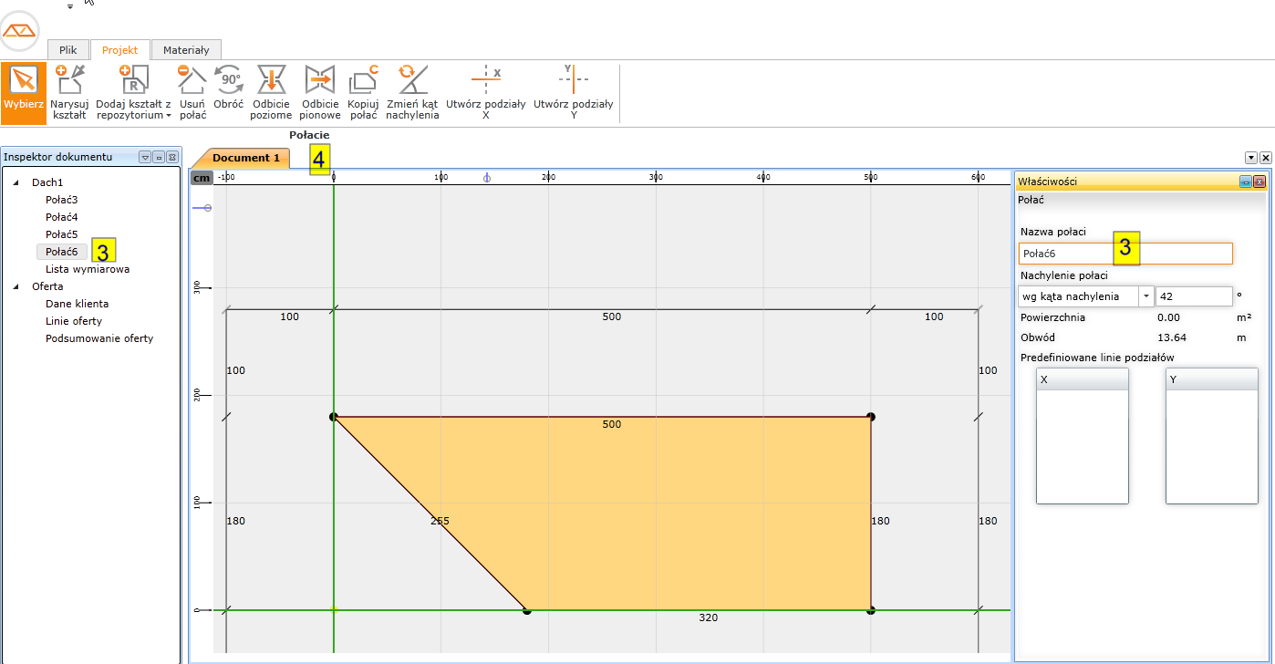 Na przykładzie poniżej przedstawionego projektu. Połacie ponumerowane od 1 do 8.