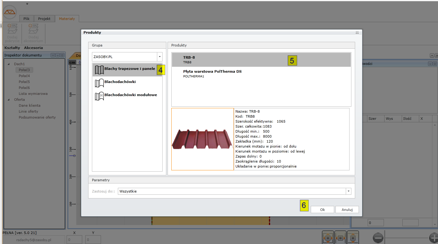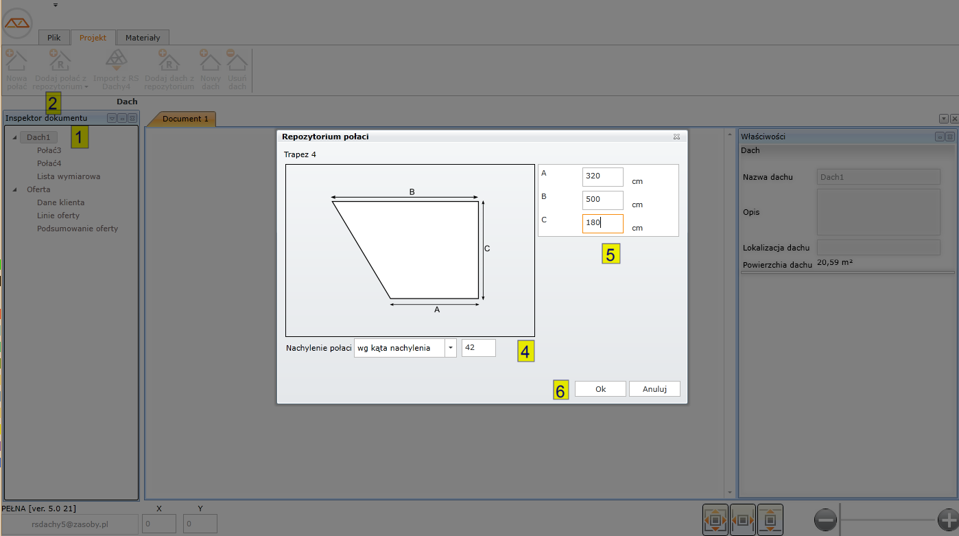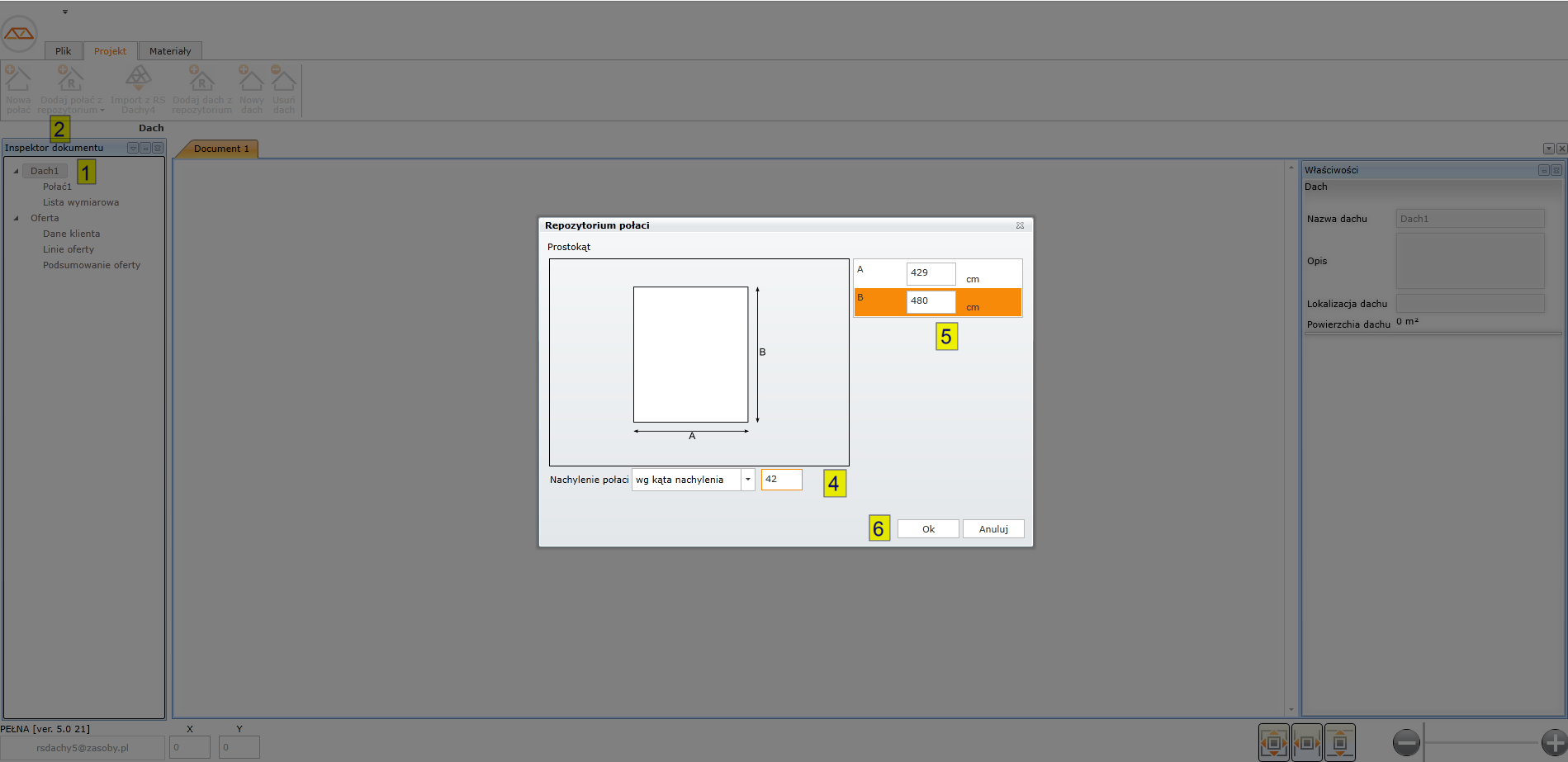 Na przykładzie poniżej przedstawionego projektu. Połacie ponumerowane od 1 do 8.