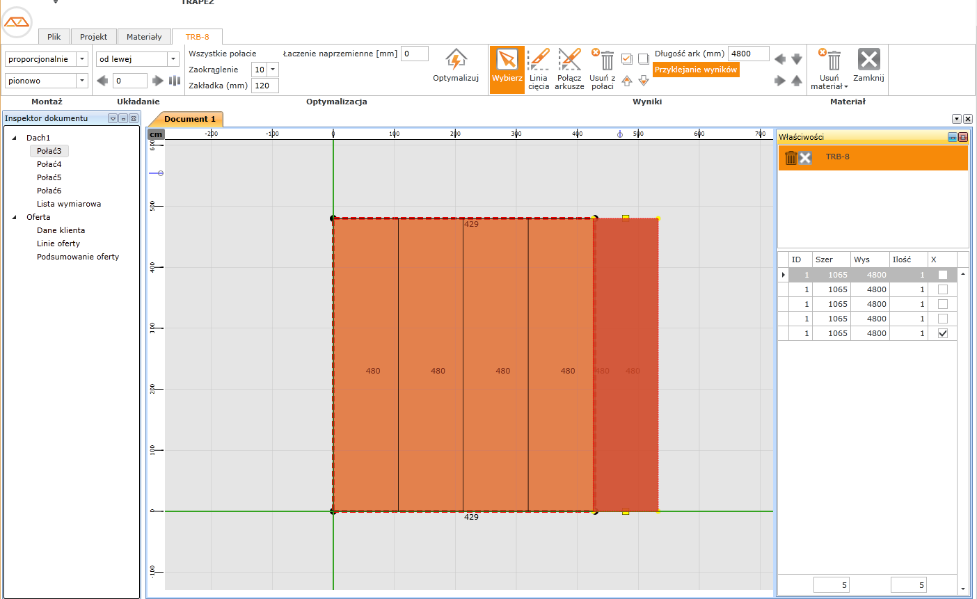 Zaznaczyć Połać3, jeden z arkuszy po prawej stronie jest zbędny (brak zostanie przykryty obróbką). Należy zaznaczyć arkusz i wybrać przycisk z sekcji Wyniki pt. „Usuń z połaci”