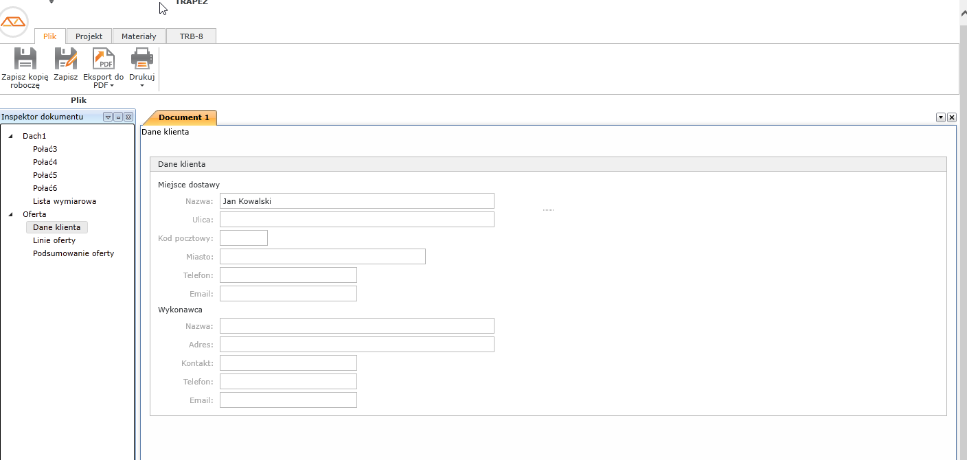 Wybrać zakładkę Plik w listwie, a następnie przycisk Zapisz. Pojawi się okienko z prośbą podania nazwy pliku. Po wpisaniu nazwy należy nacisnąć OK. Oferta jest zapisana